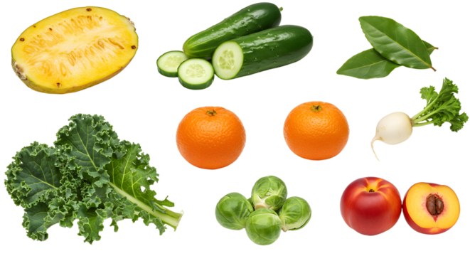 Assortment of fresh sliced and whole vegetables and fruits including yellow tomato, cucumber, kale, tangerine, brussels sprout, peach, and radish, perfect for healthy eating