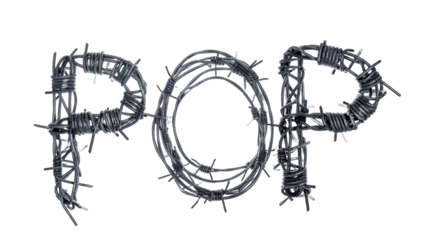 Three horizontal strands of barbed wire, two silver, one rusty, against a black backdrop