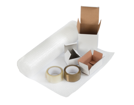 Packing and shipping items - boxes, adhesive tape, bubble wrap. Png clipart isolated on transparent background