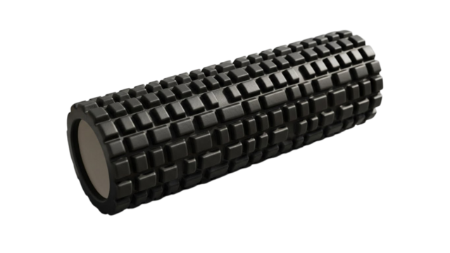 Black grid foam roller with textured surface muscle massage recovery tool fitness yoga equipment deep tissue therapy workout accessory realistic PNG graphic