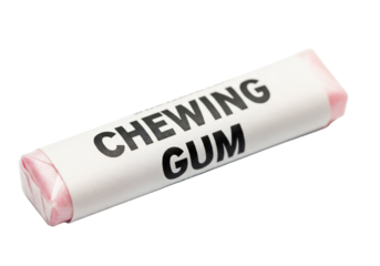 A pack of chewing gum with a white wrapper and bold black text. The gum is pink at the ends, set against a transparent background.