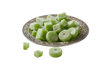 A mix of green rock candy treats on a silver plate for the traditional sweet and feast festival, known as bayram in Turkish.