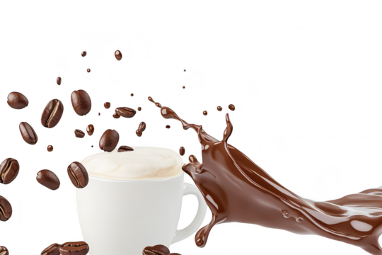 A dynamic and visually appealing scene featuring a white coffee cup with frothy milk. surrounded by splashes of rich chocolate and scattered coffee beans. set against a clean white background. perfect