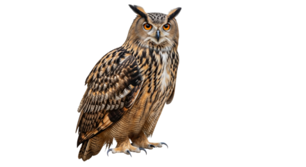 Eurasian eagle-owl, also known as bubo bubo, staring intensely with bright yellow eyes, isolated on transparent background, offering flexibility in image editing