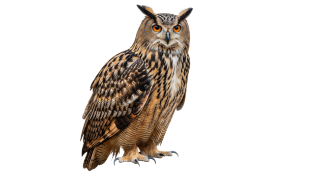 Majestic Eurasian eagle owl with piercing orange eyes isolated on transparent background, detailed wildlife close-up for nature, animal, and educational projects