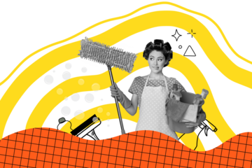 Composite trend artwork sketch image photo collage of caricaturebright color monochrome lady housewife wash clean mop wet hand hold bucket