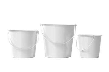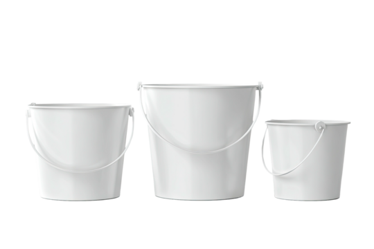 Group of white plastic buckets with lids isolated on transparent background
