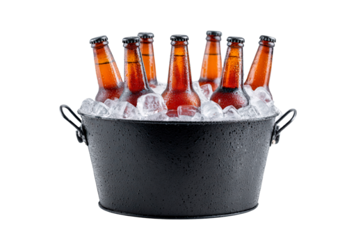 Refreshing chilled beers in ice bucket on transparent background, PNG