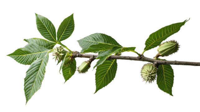 Branch of a chestnut tree with leaves and spiky seed pods on transparent background