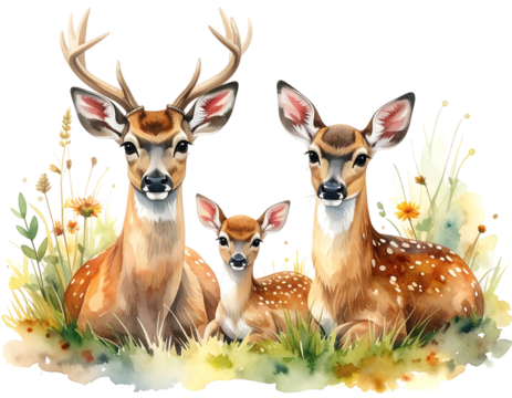 Whimsical watercolor deer family buck with antlers, doe, and fawn nestled in meadow