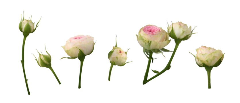 Set of pink and white rose flowers and buds isolated on white or tranparent background