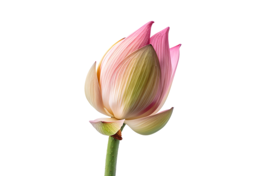 Close-up of a beautiful lotus flower bud showcasing delicate pink petals and a soft green stem against a white background.