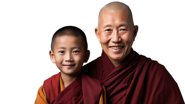 Portrait of a smiling father and son Buddhist monk with bald head, isolated on transparent background