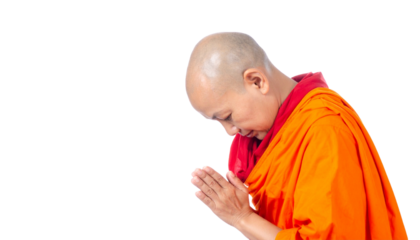 A monk in an orange robe meditates crosslegged, isolated on a transparent background