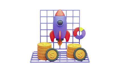 Rocket Launching with Coins and Pie Chart - Business Growth Concept