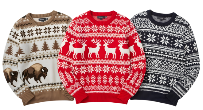 Three festive christmas sweaters with traditional nordic patterns and winter motifs like reindeer and buffalo, isolated on transparent background