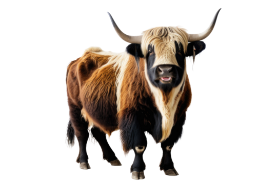 Portrait of a Scottish highland cow full body, front view, transparent, isolated on white background