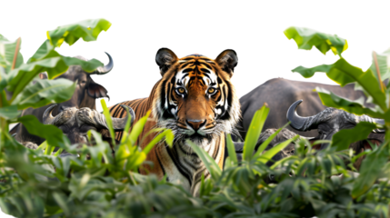 Tiger stalking a herd of water buffalo through the jungle, white background for clipping