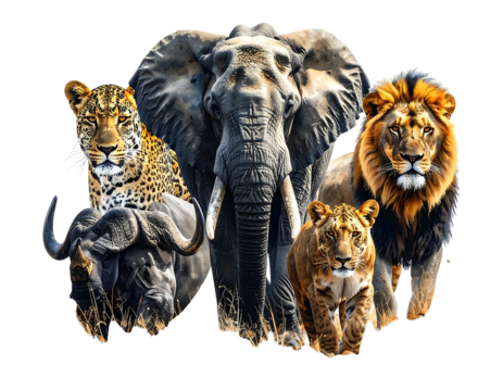 Wildlife assemblage. African animals in a group, with a lion, elephant, leopard, lioness and buffalo, against a black backdrop