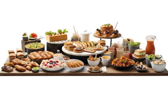 Delicious buffet feast with roasted chicken and ham isolated on transparent background