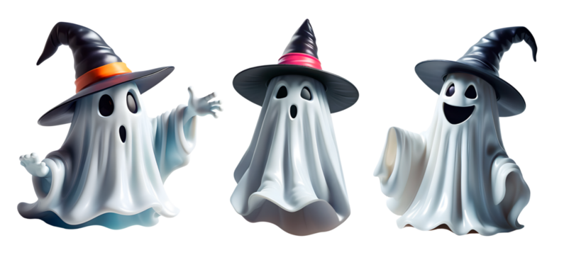 Conjunto de ícones de fantasmas 3d com chapéu de bruxo flutuando com rosto assustador