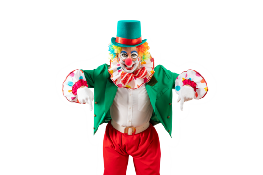 Funny clown pointing down at blank template copy spase for advertising, posters, greetings, invitations. Entertainer as Joker in a suit and wig, with clown whiteface makeup.