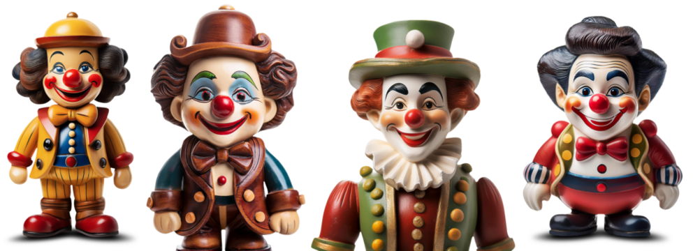 Close-up of a cute smiling wooden clown toy, looking at camera, isolated on white or transparent background. Collection and variation. Png. 19th century style funny toy. Generative Ai.