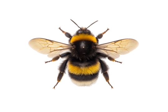 Bumblebee displayed from above, symmetrical wings fully extended, yellow and black pattern clearly visible, top-down view, isolated on a transparent background