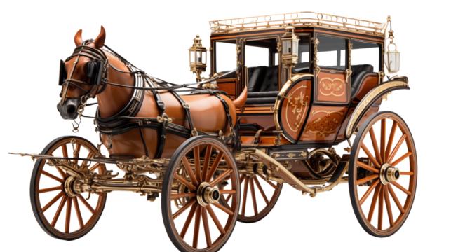 Classic horse and carriage setup, isolated on white, showcasing traditional elegance and style.