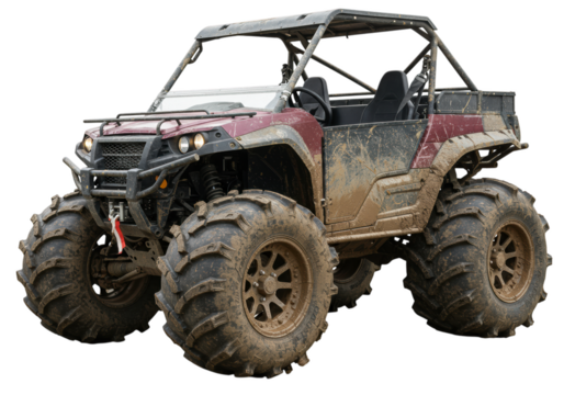 Dirty all-terrain vehicle with oversized mud tires isolated on white background, heavy-duty off-road buggy for outdoor sport and adventure concept
