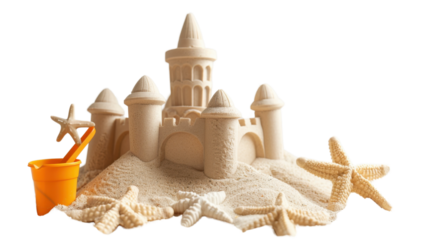 Sandcastle standing on beach with bucket and starfishes on transparent background