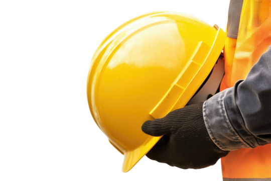 Closeup of a construction worker holding a yellow hard hat and wearing protective gloves isolated on transparent background