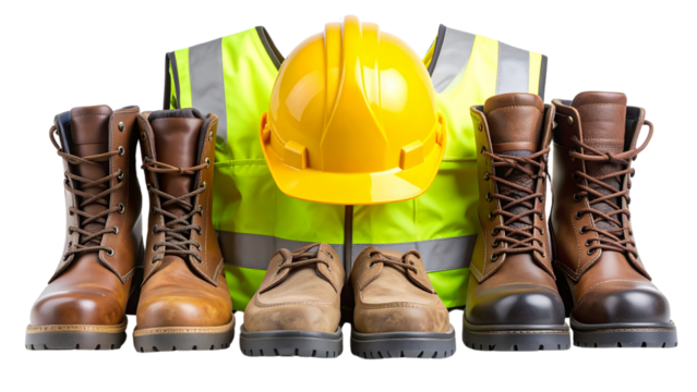 Work safety clothing including high visibility vest, leather gloves, boots and yellow hard hat are arranged on a transparent background, emphasizing workplace safety and protection