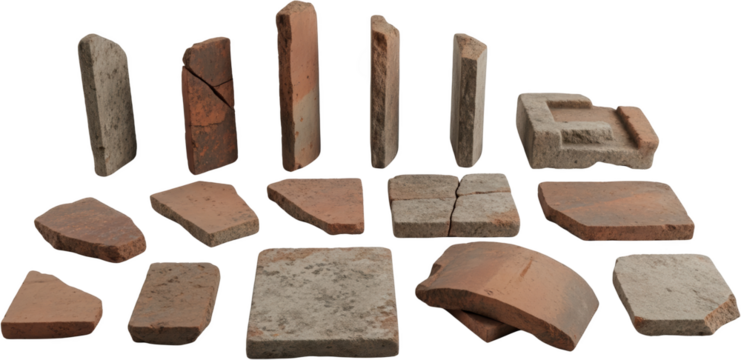 Collection of weathered stone and terracotta bricks broken tiles and stone fragments transparent background