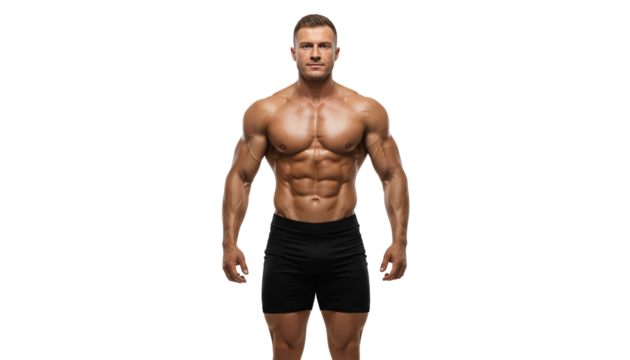 Muscular male model posing confidently, showcasing an athletic physique against a white isolated background.