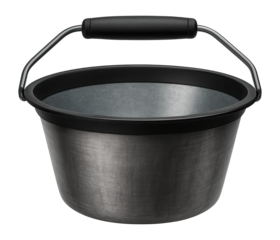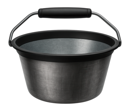 Steel mortar bucket with a wide lip for easy pouring, used in masonry work.