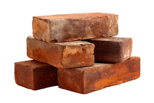 Stack of brown bricks with rectangular block shapes, rough porous texture and slightly chipped edges, neatly piled with visible mortarless gaps, isolated on transparent background.