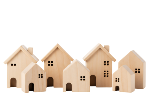 Detailed model home construction with wood framing and foundation isolated on transparent background