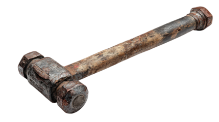Rustic sledgehammer presenting an old, handmade iron head with bolts on a damaged wooden handle, representing vintage tools