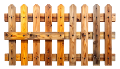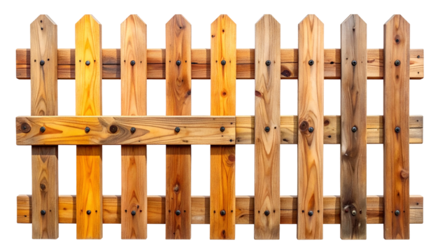 A rustic wooden fence, composed of vertical planks with weathered textures and nail details, set against a transparent backdrop