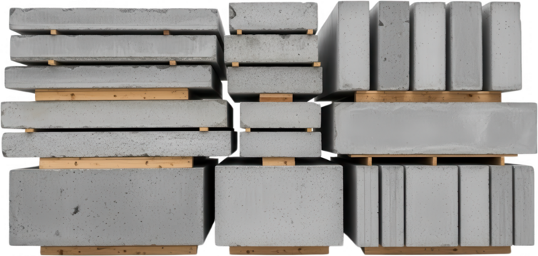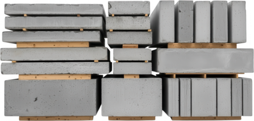 Stacked concrete blocks and beams resting on wooden pallets showing various sizes and textures in a construction material storage yard industrial heavy building infrastructure urban