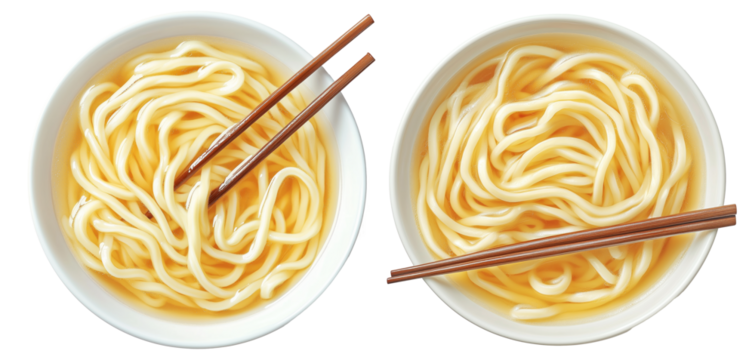 Japanese udon noodles served in light broth, top view and isolated on white background, representing Japanese cuisine