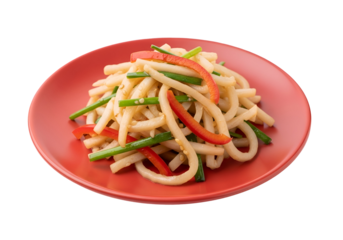 A vibrant dish of stir-fried udon noodles with red bell peppers and scallions, presented on a coral-red plate against a black backdrop.