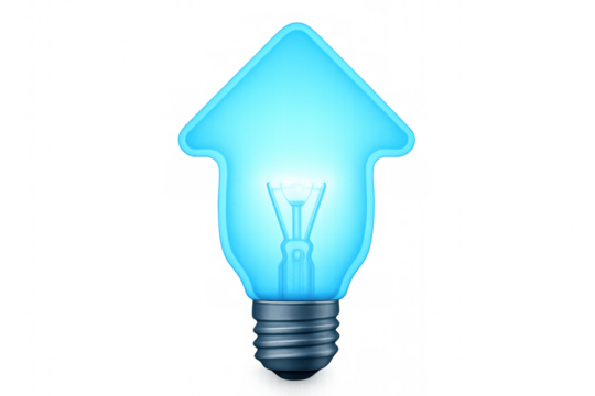 Light bulb shaped as an upward arrow illuminating, symbolizing progress, growth, and innovation, transparent background