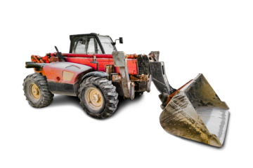 Heavy front loader or bulldozer on a white isolated background. construction machinery. Transportation and movement of bulk materials. Large bucket for earth, sand and gravel.
