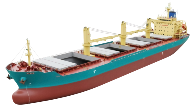 Bulk carrier ship PNG isolated on transparent background, cargo vessel with cranes for international trade and global transportation
