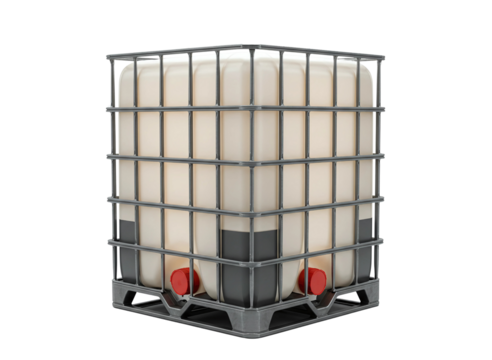 Large black plastic intermediate bulk container with metal cage isolated on transparent background