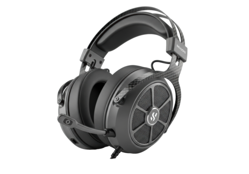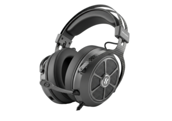 Meticulously detailed rugged industrial dark grey over-ear headset with bulky polymer earcups and carbon fiber headband, isolated on transparent background with soft reflections. Concept of advanced