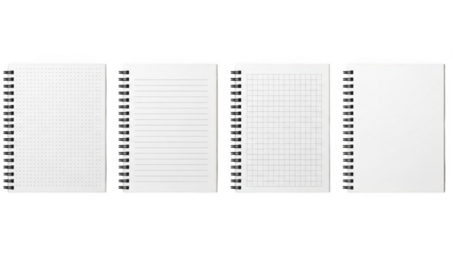 Set of four spiral notebooks showcasing different paper rulings for writing and drawing