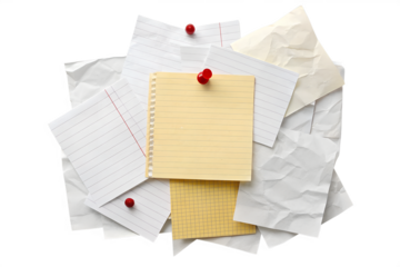 Messy Pile of Crumpled Notes and Papers with Red Push Pins Isolated on White Background Stock Photo